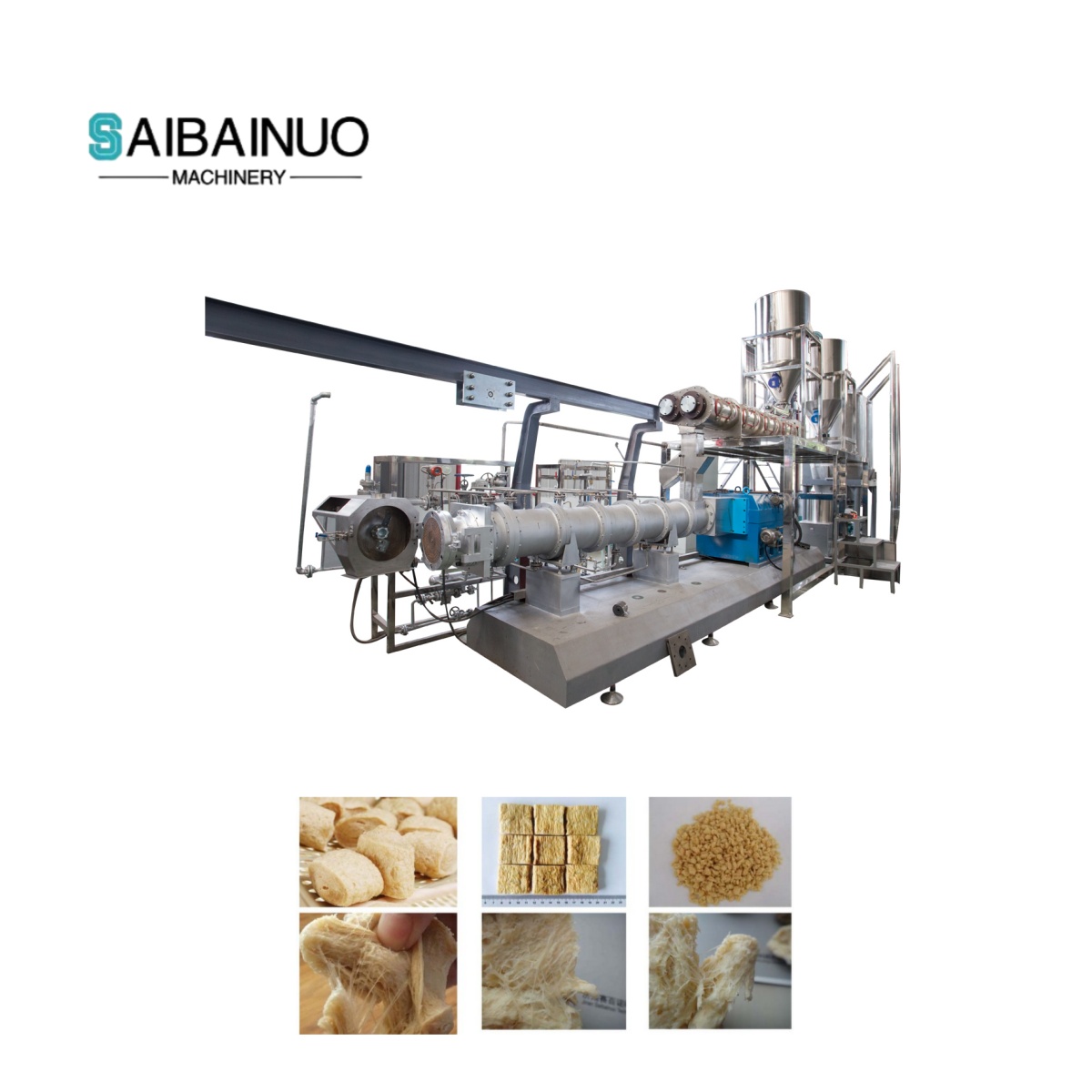 La línea de la máquina de proteínas vegetales texturizadas esDiseñado y producido con ricas experiencias en la industria de extrusores de alimentos durante 10 años. Adopta la comida de frijoles de soya a baja temperatura no grasas como materia prima principal para producir todo tipo de alimentos en proteínas texturizadas, que es nutricional y fácilmente absorbida por el cuerpo humano.